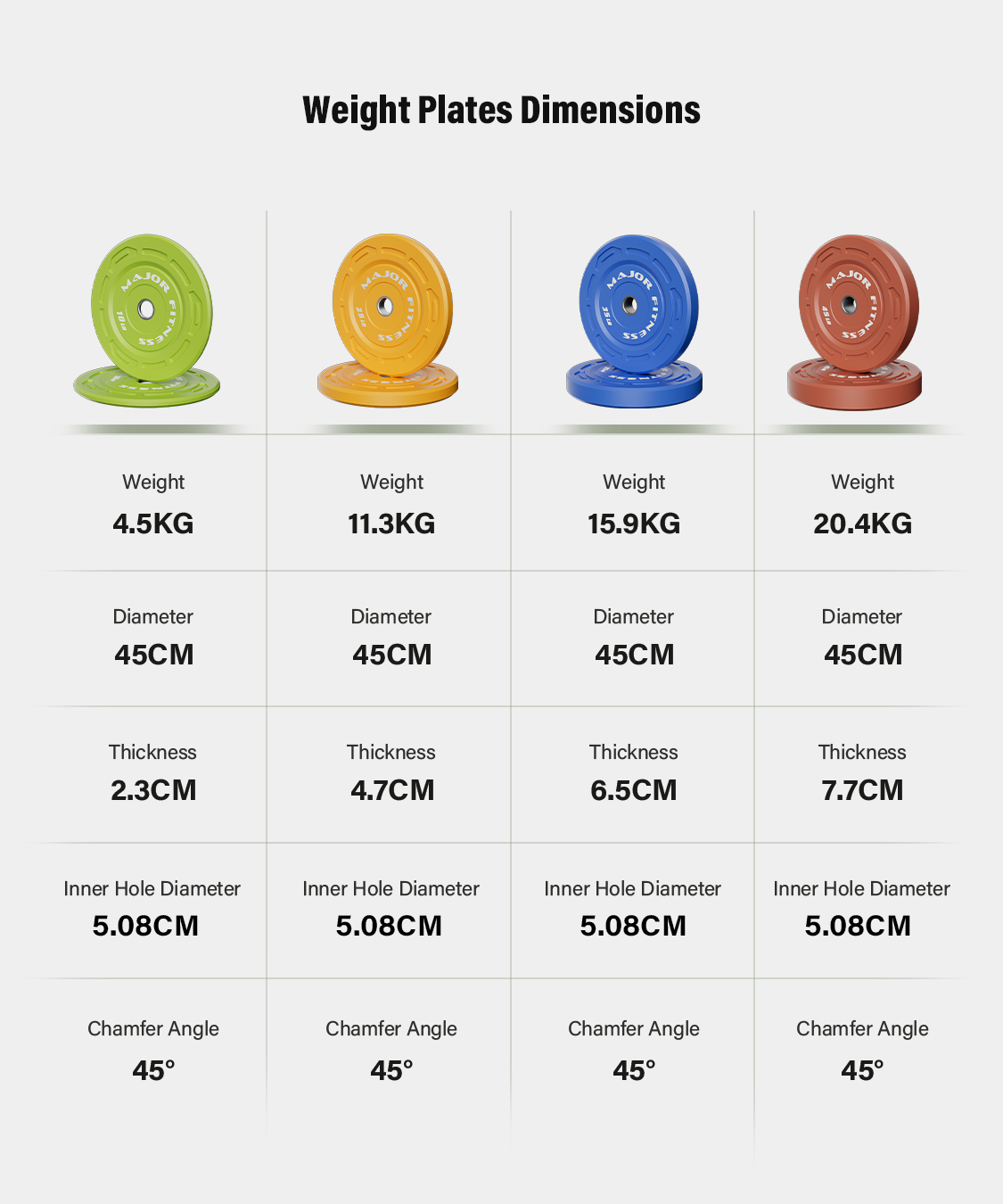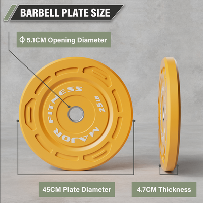 To top it all off, these color bumper plates feature vibrant finishes and clearly visible weight markings, allowing you to quickly identify them, both up close and from a distance. Additionally, they feature textured edges and side cutouts, making them easy to carry, so you can focus on taking your workouts to the next level without worrying about safety.