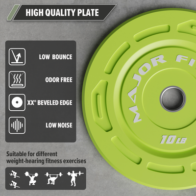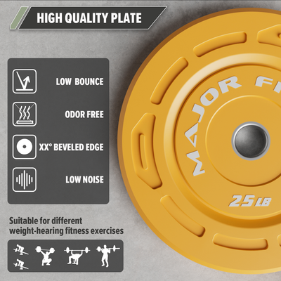 Our bumper weight plates are explicitly created for lifters looking to seize control during their home gym sessions. Whether you utilize them for squats, deadlifts, or overhead drops, these grip bumper plates are versatile enough to keep up as you perform just about any exercise. Each of these plates features a durable 2-inch stainless steel insert, ensuring a snug fit on all Olympic barbells and long-lasting performance. Our low-bounce bumper plates also boast a rubber construction that eliminates unpredictable movements, making barbells safer and more stable overall.