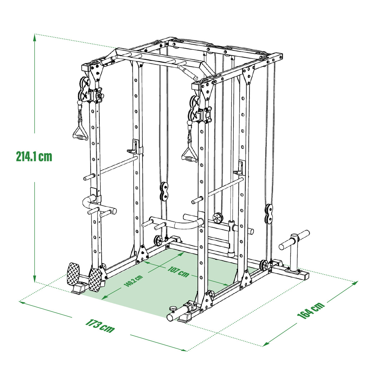 - Loaded with J-hooks, dip bars, safety arms, and 4 free handle attachments