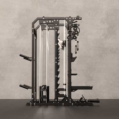It integrates five distinct training systems: a power rack, Smith machine, cable pulley system, multi-grip pull-up bar, and a 360° landmine.