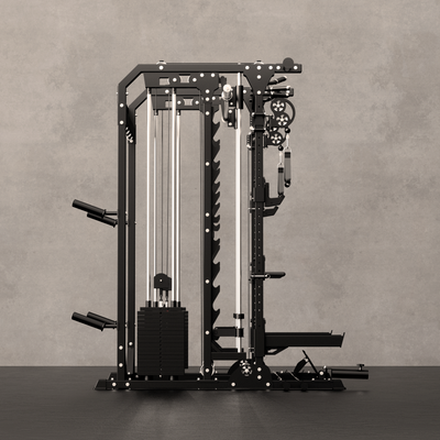 It integrates five distinct training systems: a power rack, Smith machine, cable pulley system, multi-grip pull-up bar, and a 360° landmine.
